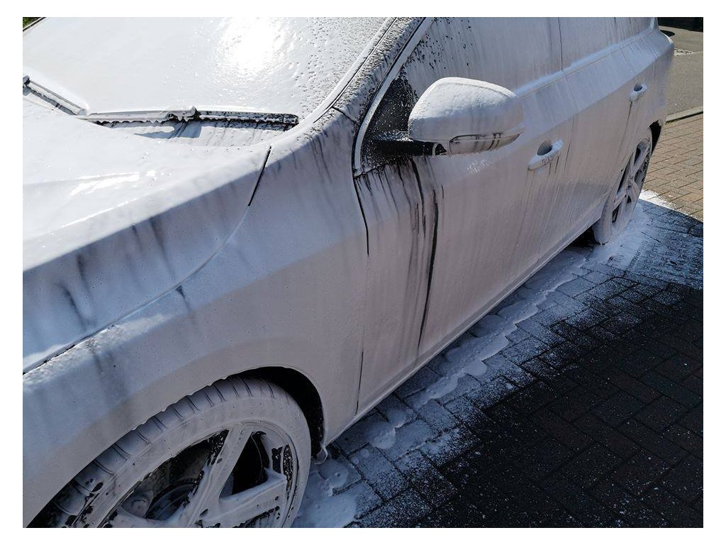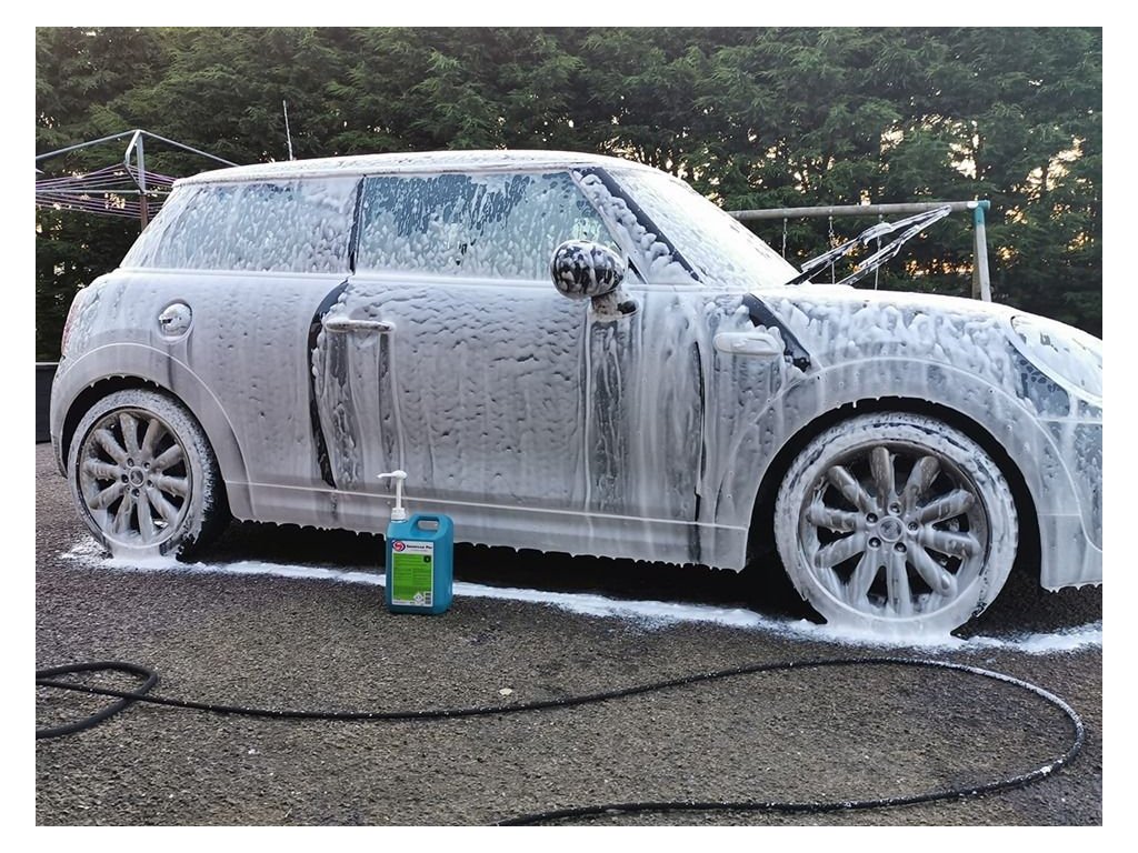 Použití jako pěnový šampon: Naneste tenkou, rovnoměrnou vrstvu pěny, poté promíchejte na povrchu karoserie pomocí mycí rukavice a opláchněte vodou.