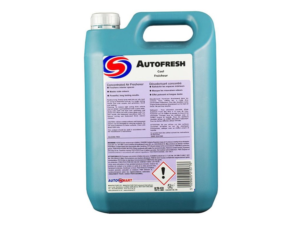 Instrukce: Provonění: Prostřednictvím Autosmart rozprašovače jednoduše nastříkejte do kabiny vozidla apod., pro dlouhodobější výsledky nastříkejte na koberce a čalounění. Zamezte promáčení povrchu. Čištění: k odstranění lehkého znečištění z interiéru vozidla zředit 1 díl autofresh s 2 díly vody. Nastříkejte na hadřík a otřete čalounění a plastové obložení. Vyčistěte čistou vlhkou utěrkou. Nejlepších výsledků dosáhnete použitím mikrovláken Autosmart. Pro těžší znečištění použijte Autosmart Brisk.